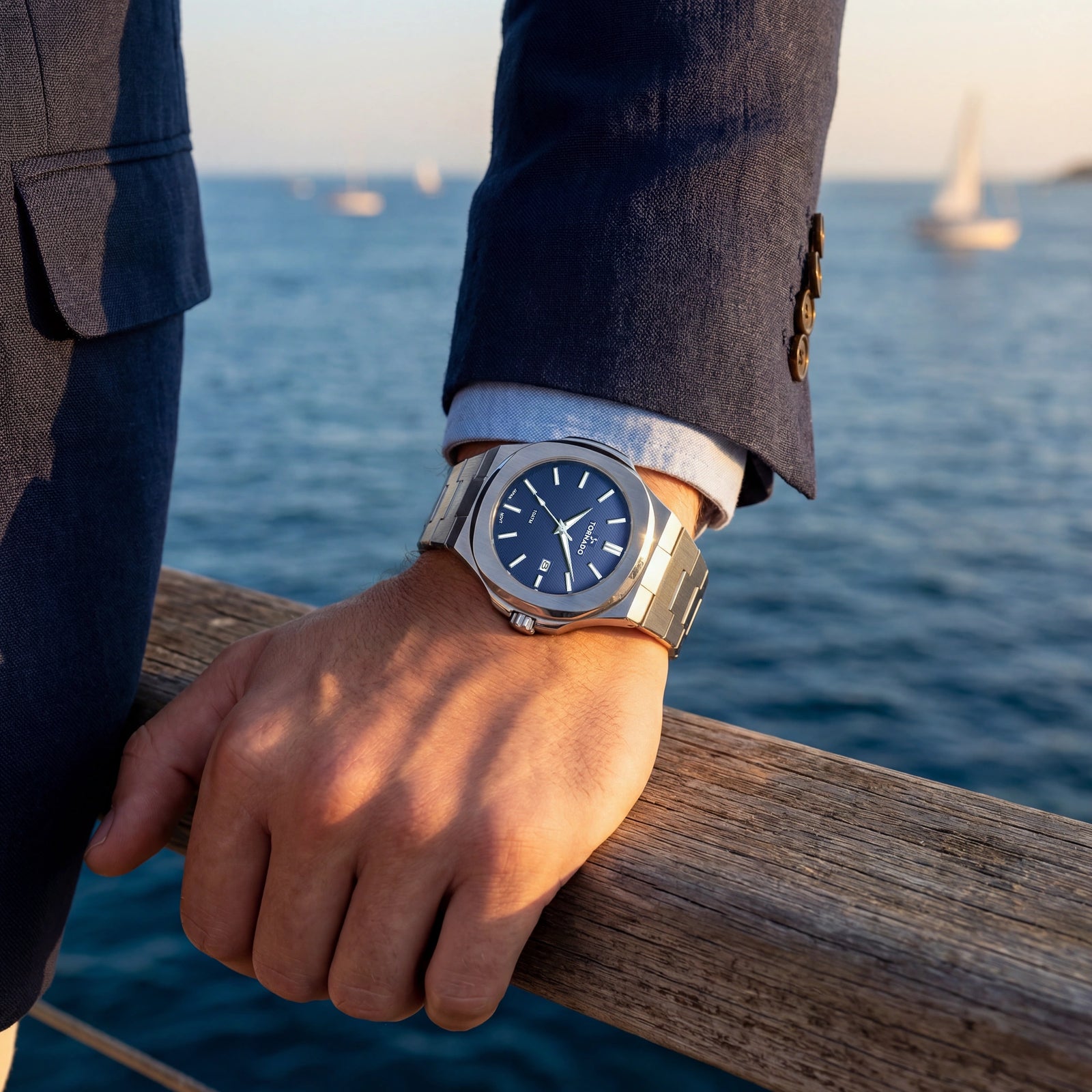 The Tornado AURORA EON in blue delivers a composed balance of structure and colour. It features a 43 mm 316L stainless steel case, finished with a controlled mix of brushed and polished surfaces. The round case is edged by an octagonal bezel that gives the watch a crisp, architectural outline.The blue dial features a horizontal striped texture and luminous hands and index markers to ensure legibility after dark, while the date display at three o’clock remains clean and unobtrusive. A sapphire-coated crystal protects the dial from daily wear and keeps the surface clear.The vertically brushed 25x20mm stainless-steel bracelet and closes with a butterfly clasp for a smooth, secure fit. Powered by the Japanese Miyota 2315 quartz movement and rated to 10 ATM, the AURORA EON is more than capable for everyday use, travel, and the occasional short swim. Backed by a three-year warranty, it offers a restrained steel sports aesthetic with a confident blue accent.