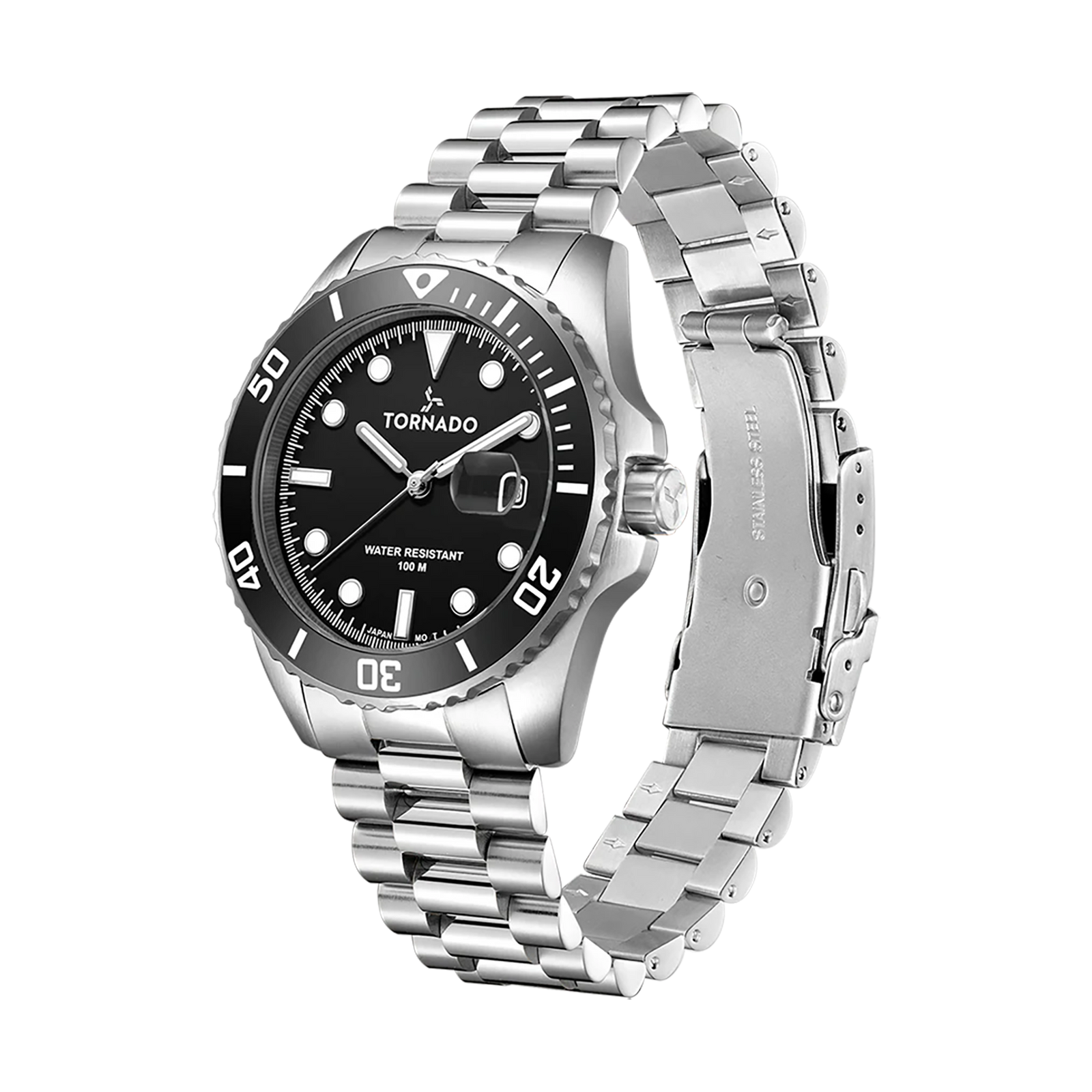 An all-time classic, engineered to last. Tornado Lumina analog men’s watch T22001-SSBB brings together a 316L stainless-steel case, a black ceramic unidirectional bezel with engraved minute scale, and a sapphire-coated crystal over a clean black dial. The date magnifier boosts legibility at a glance, while luminous indices and hands keep it readable after dark. Inside, the proven Miyota 2115 Japanese quartz movement keeps perfect time—quiet, precise, ready for the week. Boardroom polish, sport DNA. The presidential-style solid bracelet flows comfortably under a cuff and locks with a confident push-button deployant. Pair it with charcoal or navy suits, white or light-blue shirts, knit polos, chinos, or denim on the weekend. With 10 ATM water resistance, it handles rain, workouts and short swims with ease. It’s the monochromatic luxury-sport watch that looks right today and will still look right years from now.
