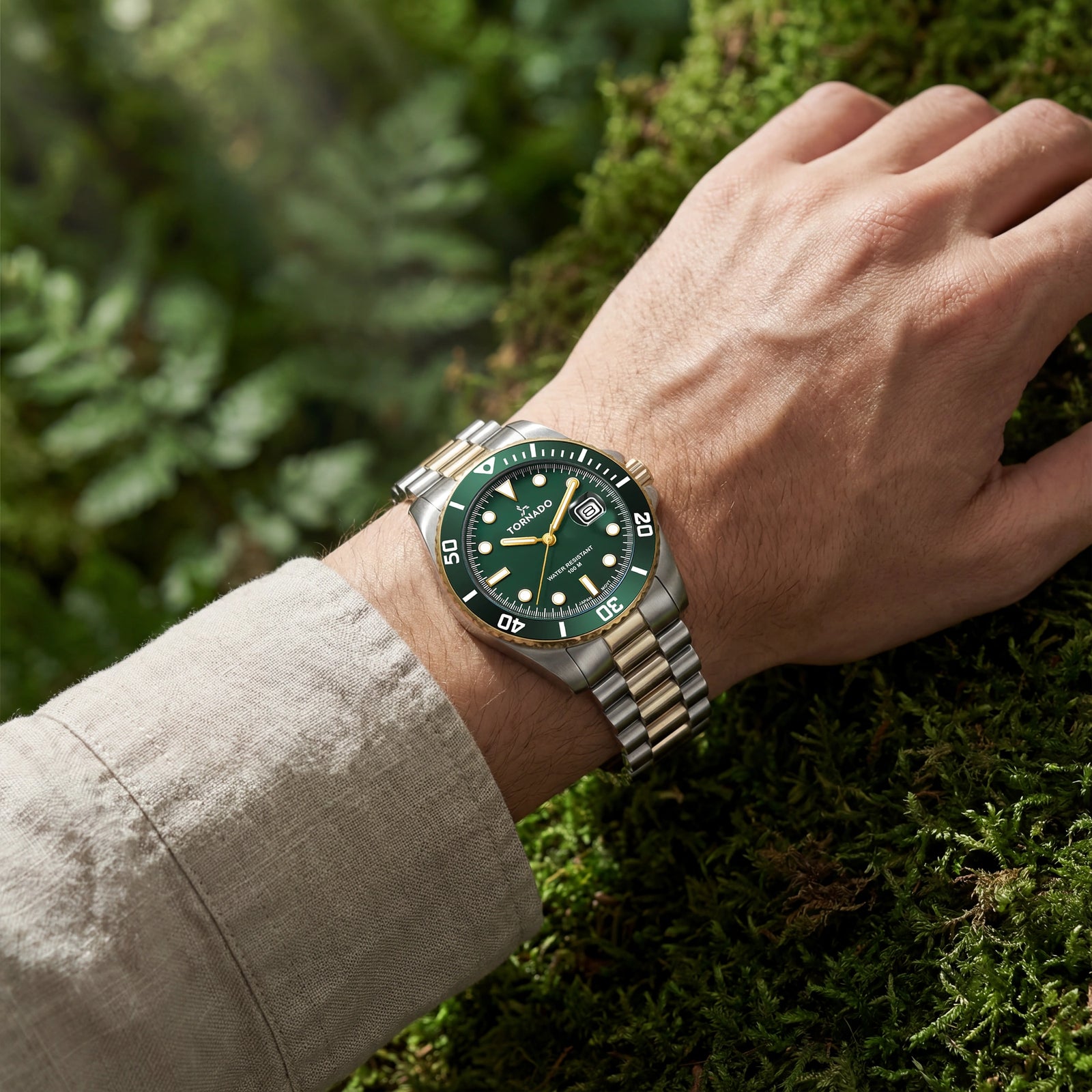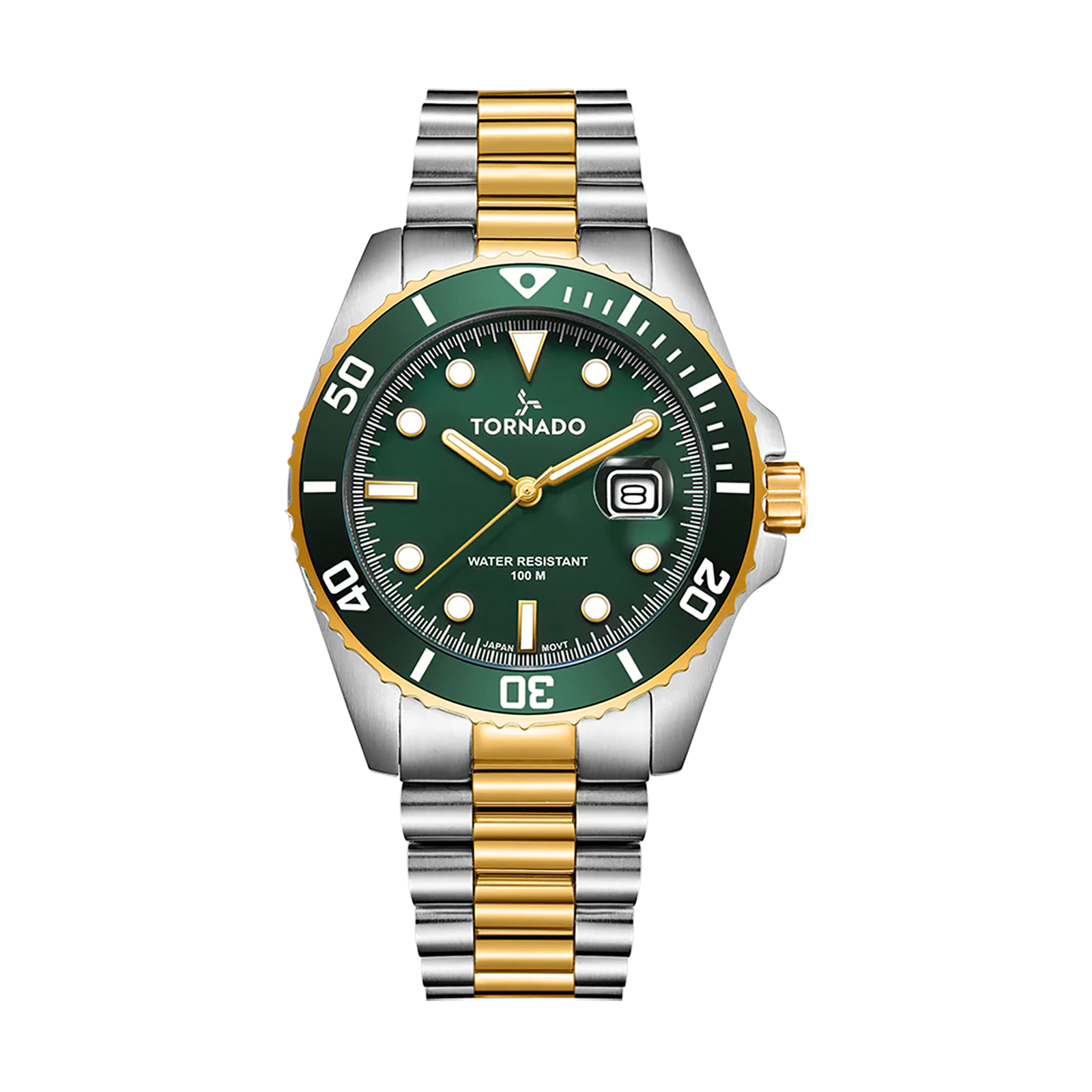A refined two-tone classic men’s watch: a 42mm 316L stainless-steel case with warm gold-tone accents, rich green dial beneath a sapphire-coated crystal, and a magnified date at 3. The black ceramic, unidirectional bezel clicks smoothly and resists scratches, while luminous markers, a two-tone presidential bracelet with push-button deployant, the precise Miyota 2115 Japanese movement, and 10 ATM water resistance complete the build. Designed for moments that matter—perfect for leaders and professionals, and spot-on for weddings, graduations, promotions—yet easy with weekend denim. Pairs effortlessly with navy or charcoal suits, white/light-blue shirts, and tuxedo black; the steel-and-gold mix feels modern and timeless, complementing gold jewelry and making a gift-ready piece worthy of being passed down.