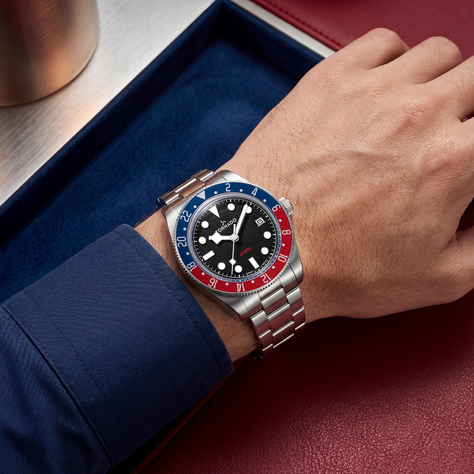 Purposeful and compact, the Tornado LUMINA DATE in silver is built around everyday functionality and proportion. The black dial finished with a fine sand texture keeps reflections in check while subtly adding depth. Luminous markers and hands remain legible after dark, and the date window at three o’clock is cleanly framed for quick reference. The 40 mm round case is cut from solid 316L stainless steel with a vertical brushed finish, enhancing the crisp, utilitarian feel. A unidirectional rotating bi-color aluminium bezel adds a functional edge, reinforcing the watch’s sport-forward character. Sapphire-coated glass protects the dial, maintaining a clear view through daily wear. A matching stainless-steel bracelet continues the brushed finish and tapers from 20 mm to 16 mm, secured with a butterfly buckle for a low-profile fit. At just 9 mm thick, the case sits comfortably on the wrist. Powered by the Japanese Miyota 2315 three-hand quartz movement and rated to 10 ATM, the Lumina Date is backed by a three-year warranty, and delivers the right mix of versatility and sophistication.