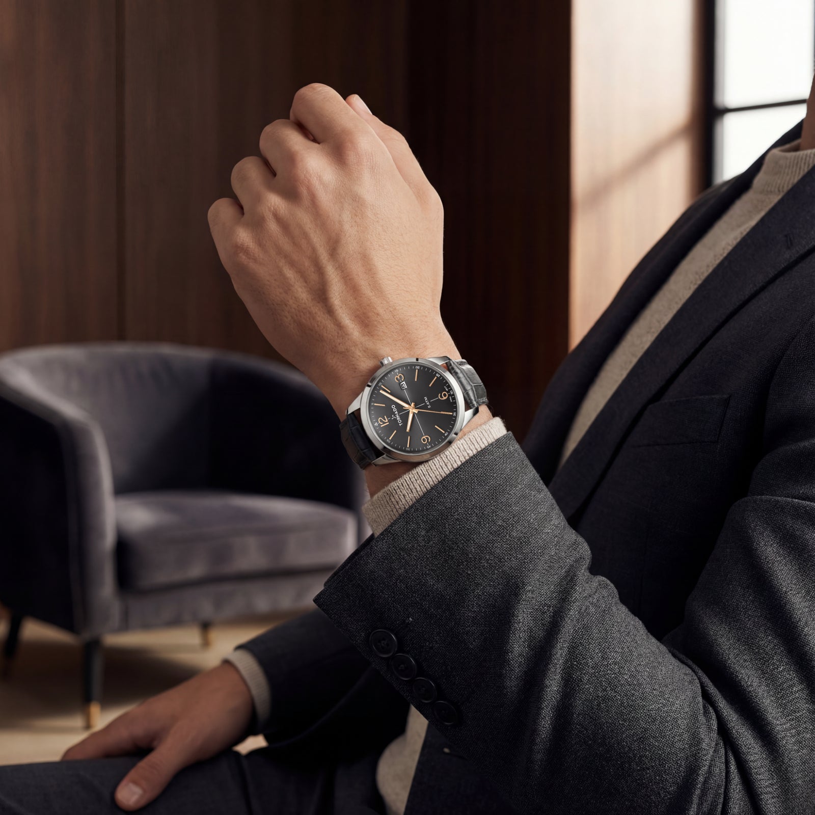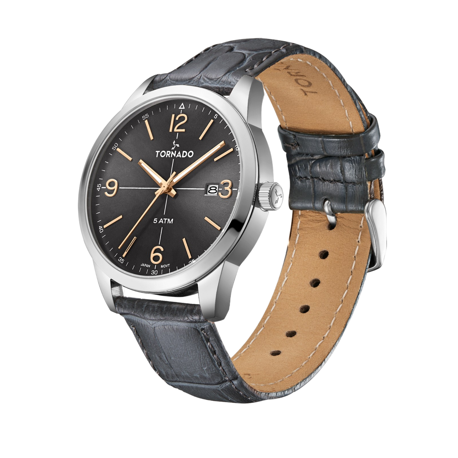 The silver-grey TORNADO CLASSIC leans into a darker shade of the, neo-retro palette. The deep grey dial carries a muted depth that reads clean and modern, while copper-toned markers and hands introduce a quiet warmth. The contrast is subtle and considered, giving the dial definition without breaking its calm tone. A date window at three o’clock is neatly integrated and remains easy to read.