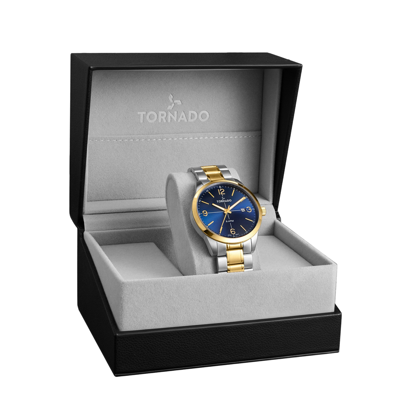 This two-tone variant of the TORNADO CLASSIC exudes calm, undeniable presence. The blue dial sits at the centre of the design, rich with a subtle play of light, but kept orderly by clean proportions. Gold-coloured markers stand out clearly against the dial, while the mixed gold and silver hands mirror the case and bracelet without drawing undue attention. The date window at three o’clock is neatly framed and easy to read at a glance.