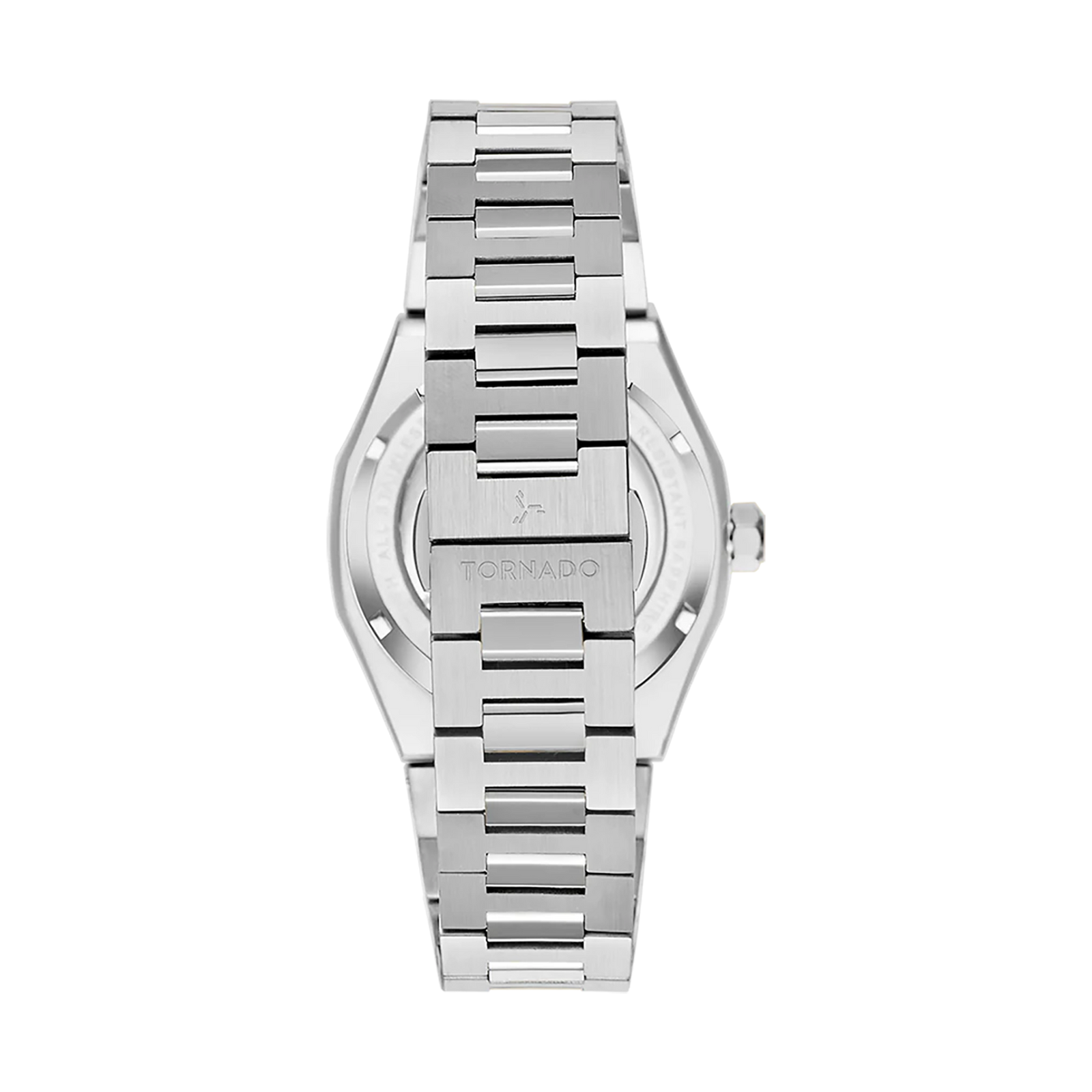 This AUTONOVA Automatic pairs contemporary case architecture a fully exposed mechanical movement. The 41 mm case is crafted from brushed 316L stainless steel and shaped with a round profile edged by an octagonal bezel, creating sharp definition without overpowering the wrist. The green skeleton dial opens the watch entirely, revealing the Miyota 8N24 automatic movement in action. Each component remains visible beneath a sapphire-coated crystal, allowing light to interact with the mechanics while maintaining surface durability and clarity. An integrated stainless-steel bracelet completes the design, combining brushed outer links with polished center links for restrained contrast. The bracelet tapers from 27 to 18 mm and secures with a butterfly clasp, preserving a clean, uninterrupted line around the wrist. With a 10 ATM water-resistance rating and a three-year warranty, this model delivers mechanical transparency within a solid, wearable framework, designed for those who value both engineering and considered form.