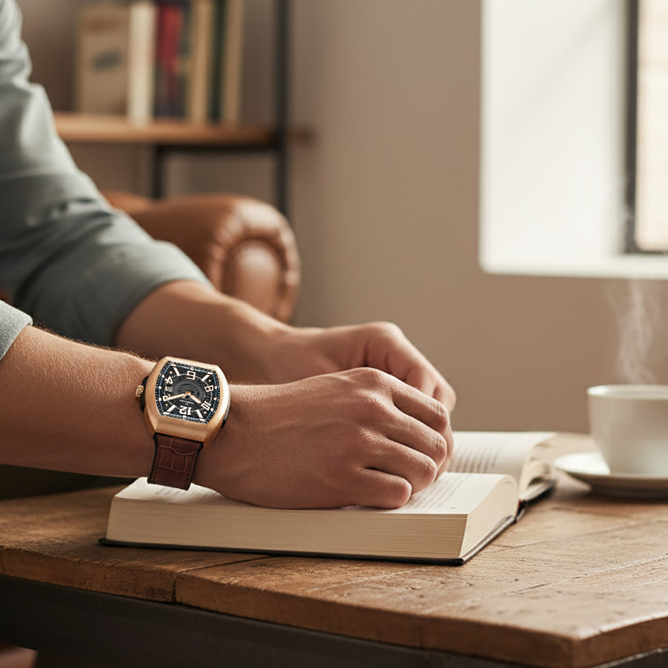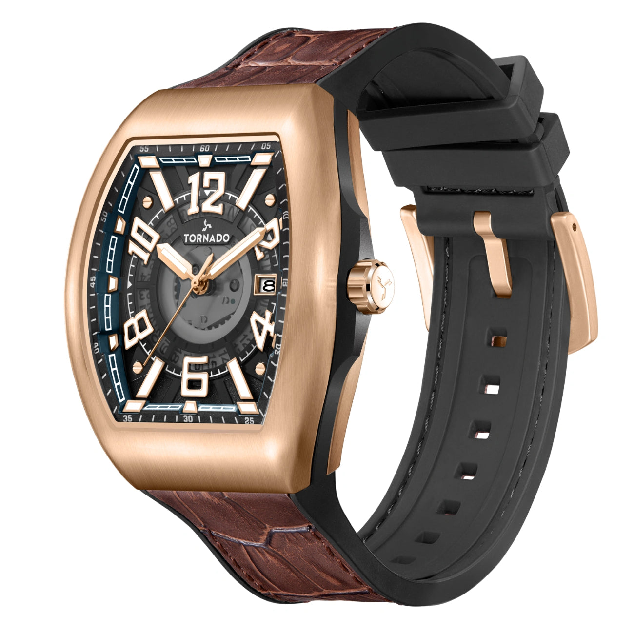 The ARISTOCRATE presents a bold, architectural profile shaped by a 44 mm tonneau case in brushed 316L stainless steel, finished in rose gold. A black dial anchors the design, built around bold applied numerals that frame glimpses of the inner mechanics. The layout is clean but expressive, pairing visual depth with a practical three-hand display and date function. Sapphire-coated glass protects the dial, preserving clarity while resisting everyday wear. Power comes from the Miyota 2315-3 quartz movement, chosen for reliability and steady timekeeping. The watch is secured with a leather-rubber fusion strap, combining genuine leather on the upper surface with a flexible rubber underside for improved comfort and durability. The watch is rated 5 ATM for water resistance. Covered by a three-year warranty, the ARISTOCRATE blends sculpted form, layered dial design, and practical engineering into a distinctive modern timepiece.