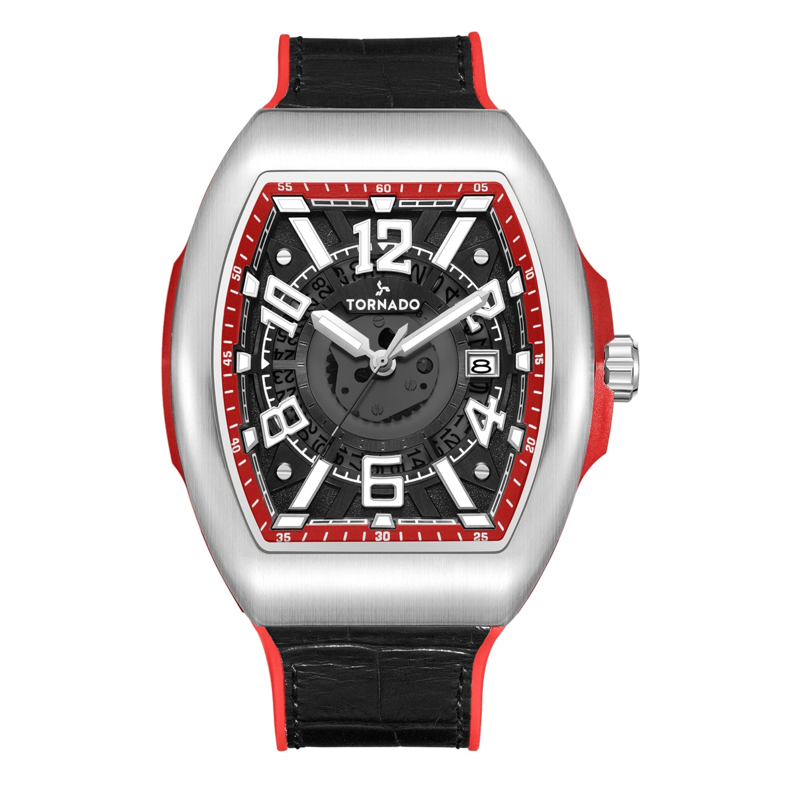 A 44 mm tonneau-shaped case in brushed 316L stainless steel gives this ARISTOCRATE model a clean, architectural presence, with a 13.5 mm profile. The silver-toned case surfaces are finished to emphasize sharp contours and a solid, engineered feel on the wrist. The black dial is defined by bold applied numerals, arranged to frame glimpses of the inner mechanics beneath. A three-hand layout is complemented by a neatly integrated date display, and protected by sapphire-coated crystal. Power comes from the Miyota 2315-3 quartz movement, chosen for consistent timekeeping and reliability. Water resistance is rated at 5 ATM, suitable for routine use and light exposure to water. The watch is paired with a leather-rubber fusion strap, combining genuine leather on the outer surface with a flexible rubber underside for improved comfort and durability. The strap secures with a classic tang buckle that aligns with the watch’s functional character. Covered by a three-year warranty, this ARISTOCRATE configuration balances sculpted casework, layered dial design, and dependable construction in a refined yet purposeful form.