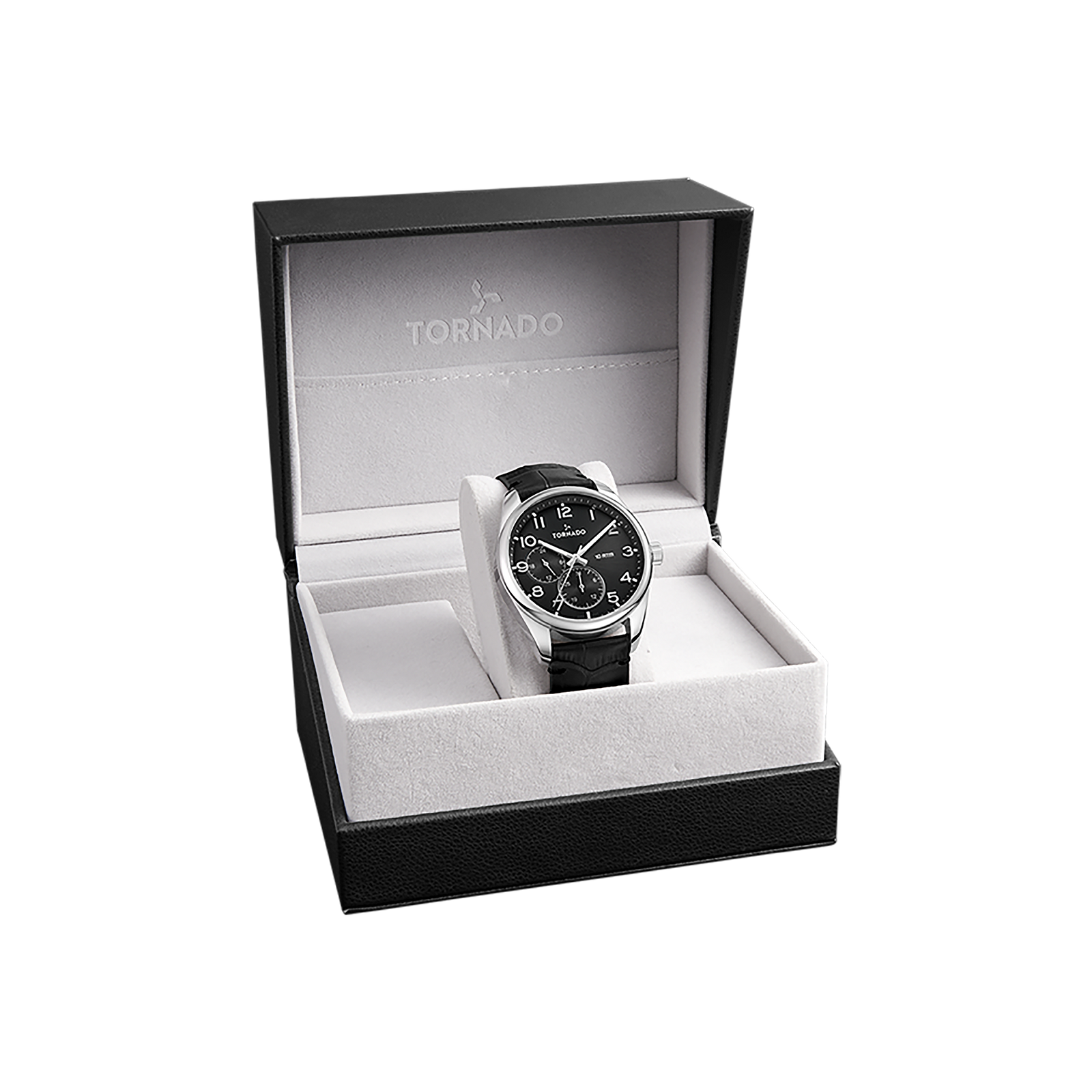 The CELESTIA CLASSIC presents a 42 mm round case crafted from solid stainless steel with a matte silver finish, giving the watch an understated profile suited for daily wear. The black dial features Arabic numerals set against a smooth sunburst surface, allowing light to move subtly across the face while preserving clear legibility. A multi-function layout adds practical depth without overcrowding the dial, maintaining an orderly and refined appearance. Protection comes from a sapphire-coated crystal, chosen for its clarity and resistance to scratches. Inside, the Seiko VX7R quartz movement delivers reliable multi-function performance, supporting consistent timekeeping with minimal maintenance. Water resistance is rated at 10 ATM, for sufficient protection against routine exposure. The watch is fitted with a genuine leather strap finished with a crocodile pattern, reinforcing the classic character. It secures with a traditional tang buckle, reinforcing the watch’s conventional appeal and ease of wear. A three-year warranty completes the offering, underscoring its dependable construction and long-term usability.