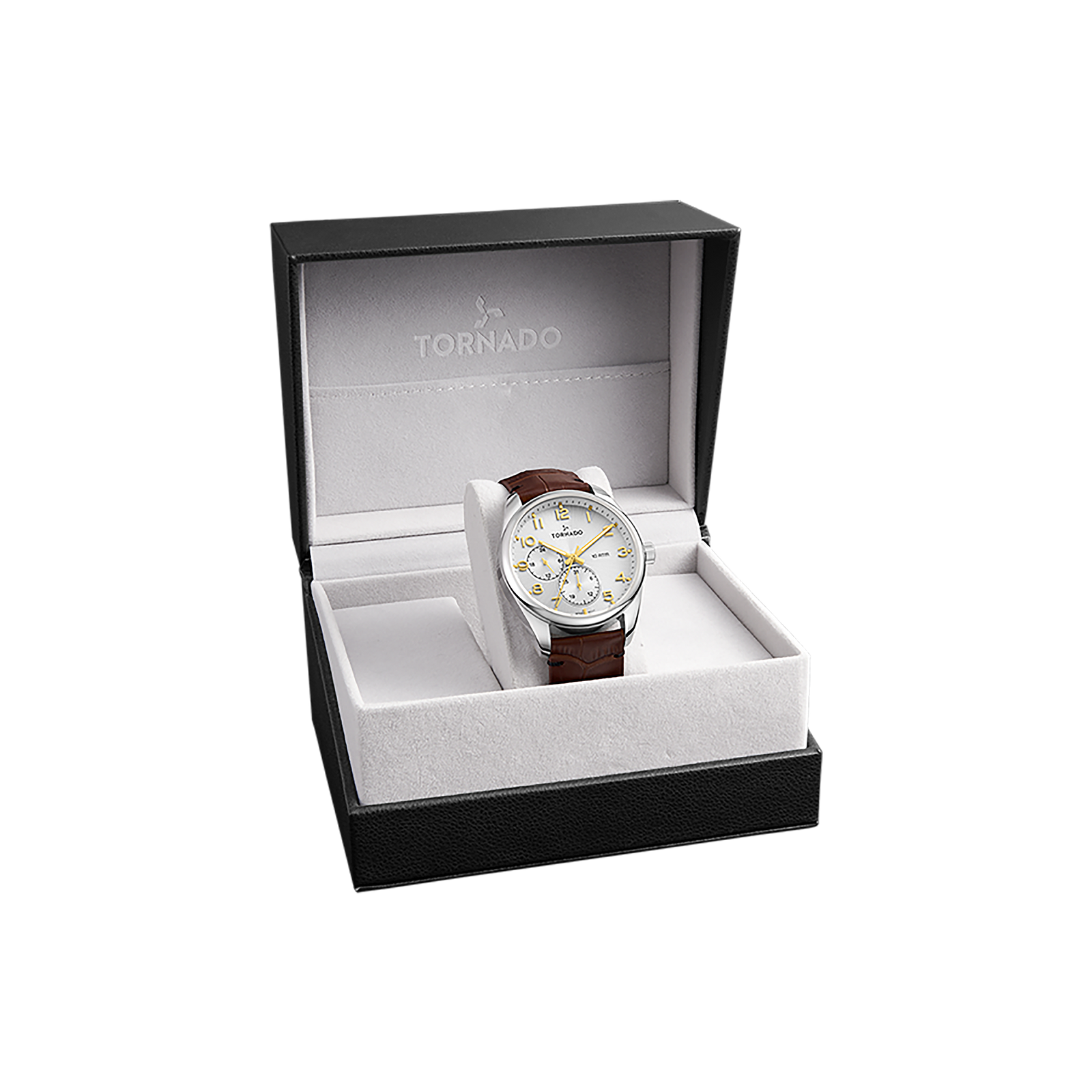This CELESTIA CLASSIC variant sports a 42 mm round case crafted from 316L stainless steel and finished in a muted silver, giving the watch a classic elegance. The white dial carries a smooth sunburst finish that catches light subtly, paired with well-defined Arabic numerals for clear legibility. The multi-function layout is arranged with care, adding practical complication displays without crowding the dial. A sapphire-coated crystal protects the face, preserving clarity while offering improved resistance to scratches. Inside, the Seiko VX7R quartz movement drives the watch with reliable accuracy and stable multi-function performance. Water resistance is rated at 10 ATM, making it suitable for daily wear and routine exposure to water without concern. A brown genuine leather strap embossed with a crocodile pattern completes the design, adding warmth and a traditional touch against the silver case and white dial. The strap secures with a classic tang buckle for a clean, familiar fit. The watch is backed by a three-year warranty, reflecting confidence in its construction and long-term durability.