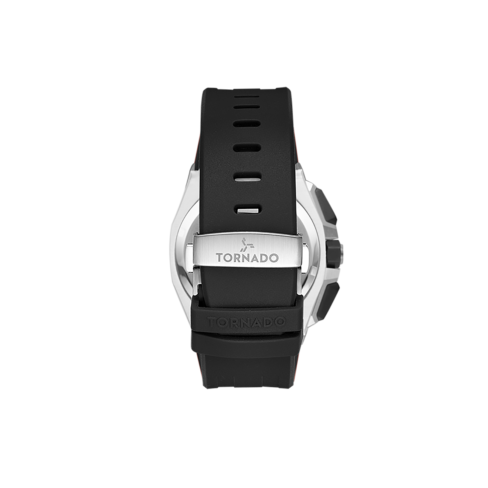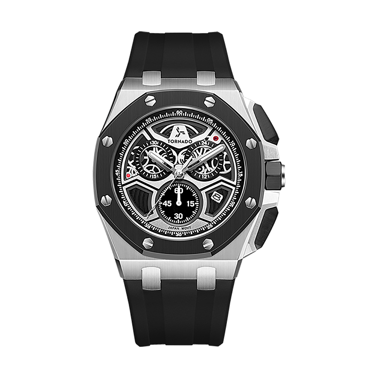 The LUMINA CHRONOSPHERE in silver presents a confident chronograph profile with a slightly classic undertone. Its 43 mm case is formed from 316L solid stainless steel and treated with alternating brushed and polished finishes that emphasize the geometry. A sapphire-coated crystal sits above the dial, offering clarity and everyday protection. The dial is toned black, and provides a sharp backdrop for the chronograph layout. At its core is the Miyota JS05 movement, selected for its reliability and precise chronograph operation. With a water resistance rating of 10 ATM, the watch is built to handle daily exposure with ease. A black silicone strap completes the piece, chosen for flexibility, durability, and comfort. The strap flows smoothly into the case and is secured with a butterfly buckle. Measuring 28 x 24 mm, the strap proportions complement the case thickness of 12.5 mm. Backed with a three-year warranty, this Lumina Chronosphere reflects a purposeful blend of sport-driven engineering and refined stainless steel execution.