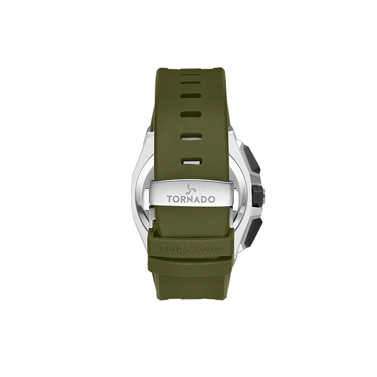The LUMINA CHRONOSPHERE in silver with a black/green dial leans into a more technical, instrument-driven character. The 43 mm case is crafted from 316L solid stainless steel and finished with a careful balance of brushed and polished surfaces. Its round profile is sharpened by a fixed octagonal bezel, a detail that adds structure. Ssapphire-coated glass protects the dial while maintaining clarity under varying light conditions. The dial combines black and silver with green accents to create contrast and depth, allowing the chronograph layout to remain clear and legible. Subdials are positioned with visual balance. Powering the watch is the Miyota JS05 chronograph movement, known for dependable timekeeping and consistent chronograph performance. With a water resistance rating of 10 ATM, the watch is built to handle daily wear with confidence, including incidental water exposure. A green high-quality silicone strap completes the design, chosen for its flexibility, durability, and comfort during extended wear. The strap integrates cleanly with the case and fastens securely with a butterfly buckle, keeping the overall profile streamlined. Measuring 28 x 24 mm at the band and 12.5 mm in case thickness, the proportions feel substantial yet controlled on the wrist. Backed by a three-year warranty, this Lumina Chronosphere offers a composed blend of sport utility, colour contrast, and refined construction.