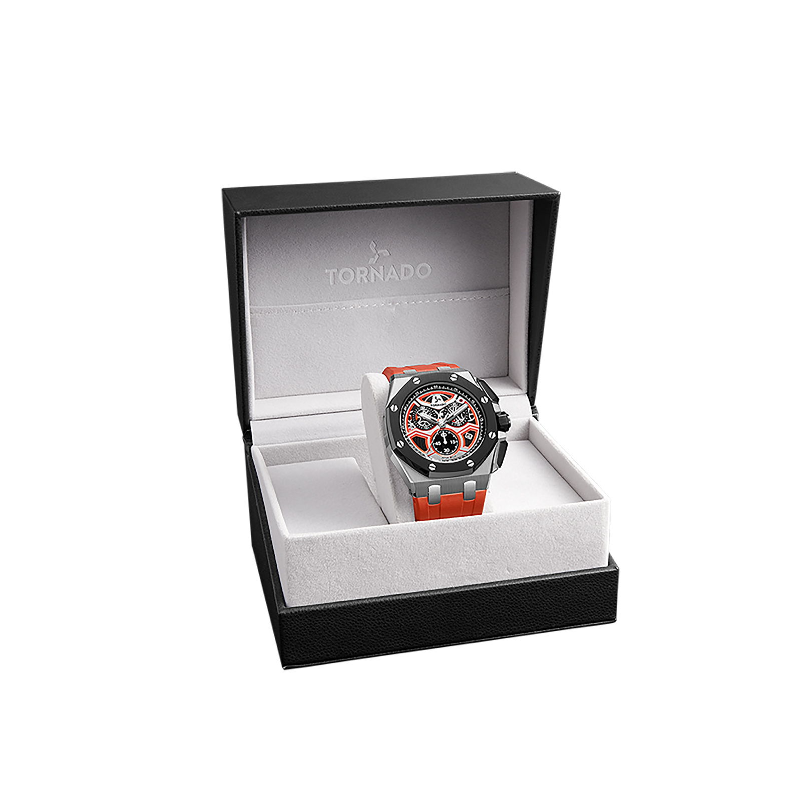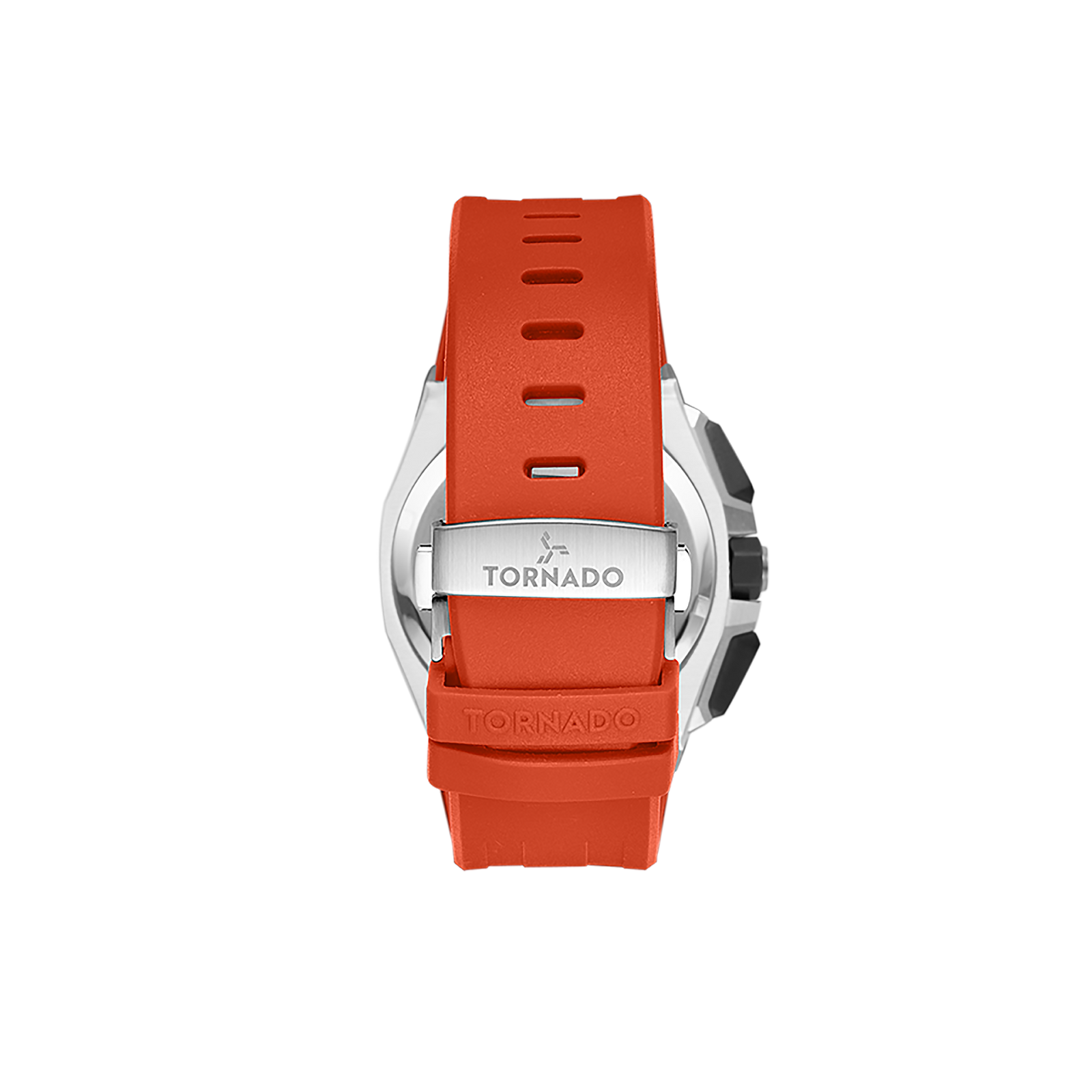 The Tornado Lumina Chronosphere chronograph in silver and orange presents a more expressive take on the collection’s technical design. The 43 mm case is formed from 316L solid stainless steel, finished with alternating brushed and polished surfaces that give the watch visual depth while keeping reflections controlled. The 12.5 mm thick round case is framed by an octagonal bezel, adding angular definition and a distinctly modern edge. A sapphire-coated glass sits above the dial, offering durability and clear visibility. The orange accented dial brings energy to the chronograph layout, with subdials arranged for balance and easy reading. The colour choice enhances legibility while giving the watch a bold, contemporary character. At the core is the Miyota JS05 chronograph movement, selected for reliable operation and precise timekeeping. The watch carries a water resistance rating of 10 ATM. An orange high-quality silicone strap reinforces the sporty tone while providing flexibility and long-wearing comfort. The strap integrates smoothly with the case and secures with a butterfly buckle for a clean, uninterrupted profile on the wrist. Covered by a three-year warranty, this Lumina Chronosphere balances bold colour, functional chronograph performance, and solid construction in a cohesive design.