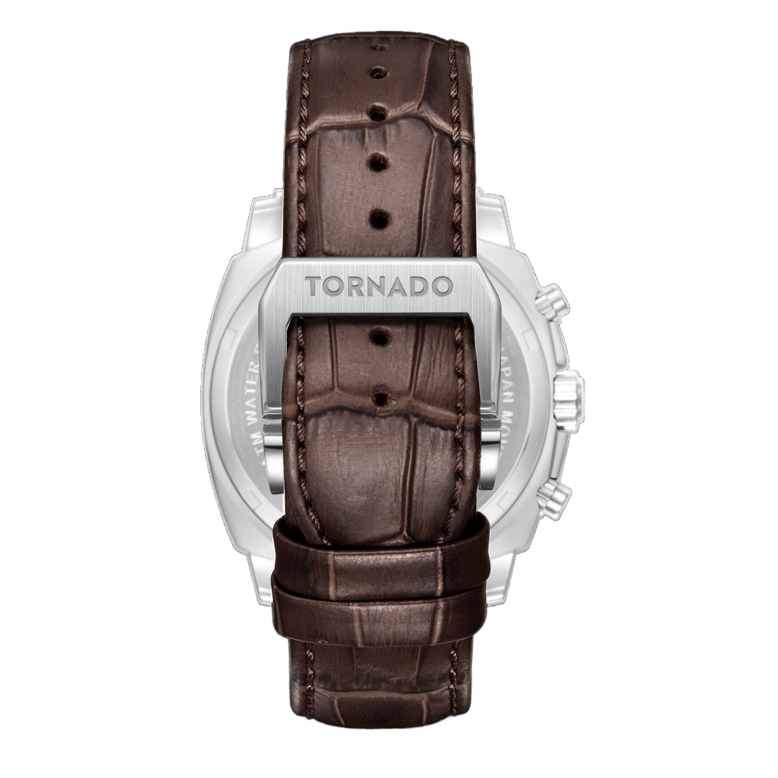 This Tornado Chronograph dress watch is a masterpiece in contemporary classic watch design. The 42 mm case is crafted from 316L stainless steel with a rounded bezel, creating a bold silhouette on the wrist. The case is bound by a genuine leather strap with a crocodile pattern, furthering the classic look, while being closed by a deployant buckle. The dial is finished in ivory with a matte sand-texture, and sits beneath sapphire glass, offering both visual depth and reliable scratch resistance. Movement is powered by the Seiko VK64 chronograph, delivering precise timekeeping and responsive chronograph operation.