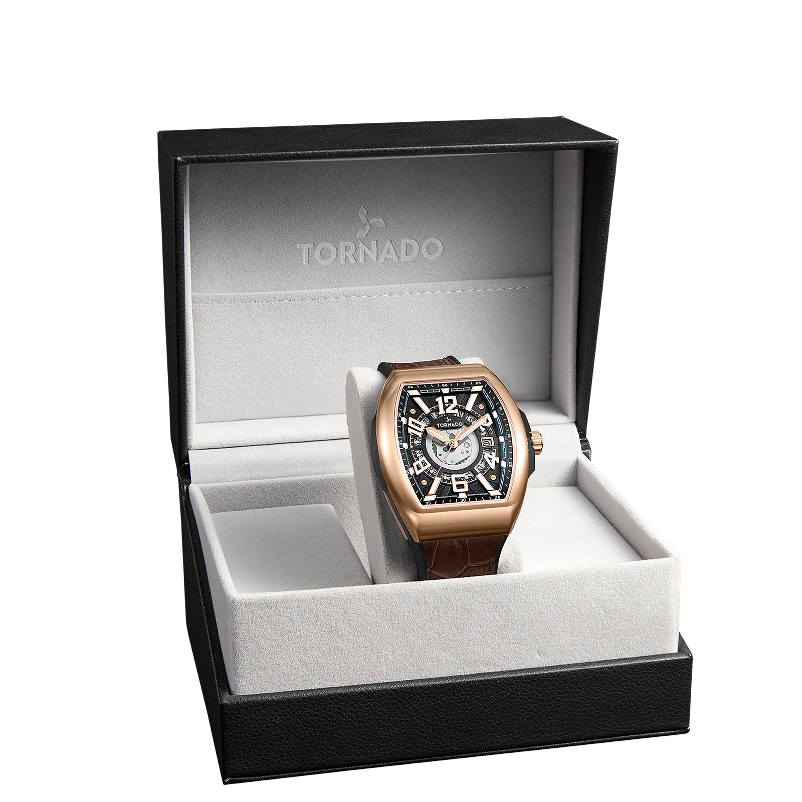 Tornado Xenith's Analog Watch with black dial, rose gold case, and brown leather-rubber strap. 2315-3 Japanese quartz movement, sapphire coated glass. 5ATM water resistant. 3-year warranty included.
