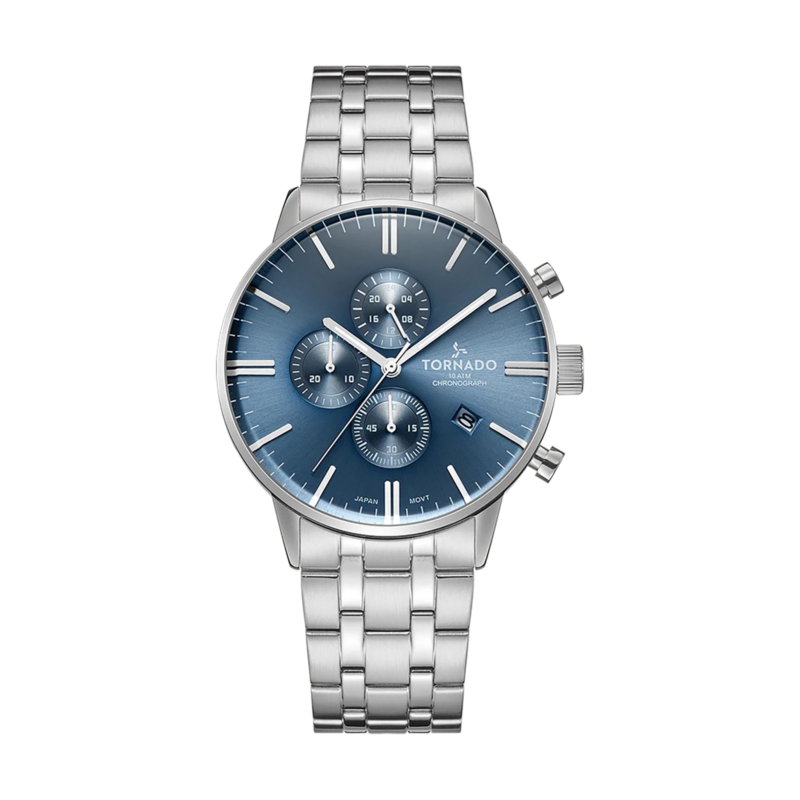 The CELESTIA ELITE in blue brings a cooler technical tone to the collection. The 43 mm round case is fashioned from 316L solid stainless steel, with brushed planes softened by polished accents that catch the light along the bezel and lugs. A matching stainless-steel bracelet continues this interplay of finishes, secured by a solid deployant buckle that sits cleanly on the wrist. The blue dial is laid out with clarity, finished with luminous markers. Three subdials are positioned to support the chronograph functions, while a neatly placed date window adds to the functional layout. Sapphire-coated glass protects the dial, preserving legibility and surface clarity over time. At the core is the Miyota JS15 chronograph movement, valued for consistent performance and dependable accuracy. With a 10 ATM water resistance rating, the Celestia Elite is engineered to handle regular use with confidence. The watch is backed by a three-year warranty, underscoring Tornado’s emphasis on durability, precision, and long-term wear.