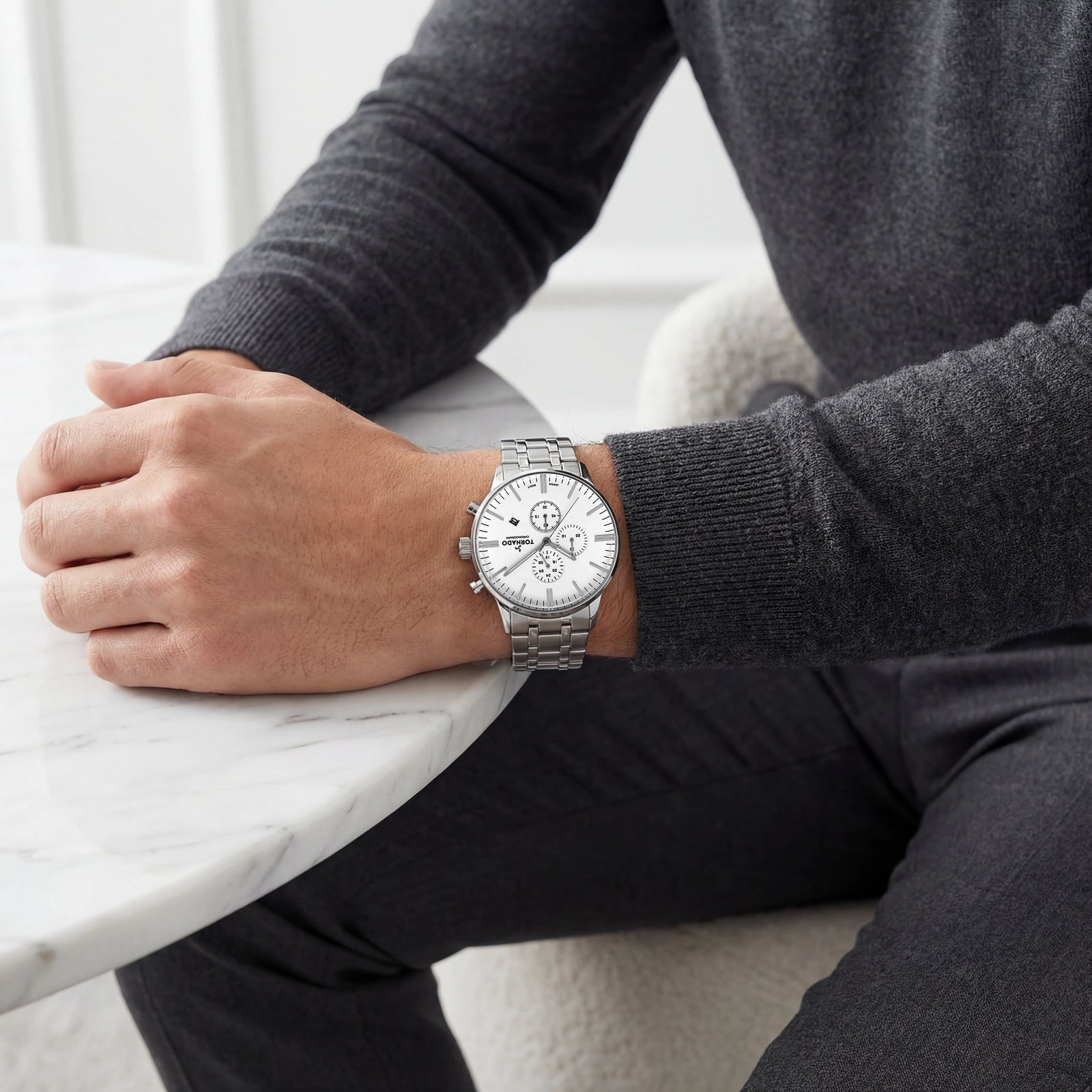 This CELESTIA ELITE chronograph pairs a crisp white dial with a fully silver stainless-steel build. The 43 mm round case is crafted from 316L solid stainless steel, finished with a mix of brushed and polished surfaces. The matching bracelet mirrors this dual finish and closes with a solid deployant buckle for a secure, streamlined fit. The white dial exudes elegant simplicity, and is enhanced with luminous silver-toned hands and hour markers stand out cleanly against the light background, while three chronograph subdials are positioned at 12, 9, and 6, creating a symmetrical layout. A discreet date display at 4 o’clock adds functionality without crowding the dial. Sapphire-coated glass protects the surface, maintaining clarity and resistance to everyday wear. Powering the watch is the Miyota JS15 chronograph movement, chosen for reliable timekeeping and precise chronograph operation. With a water resistance rating of 10 ATM, the Celestia Elite is built to handle regular exposure with confidence. The watch is supported by a three-year warranty, a testament to Tornado’s dependable construction and long-term performance.