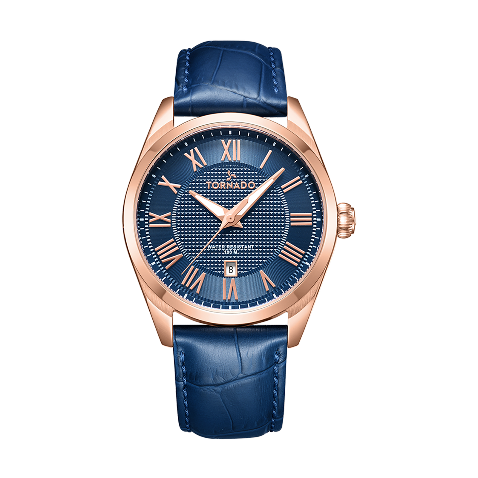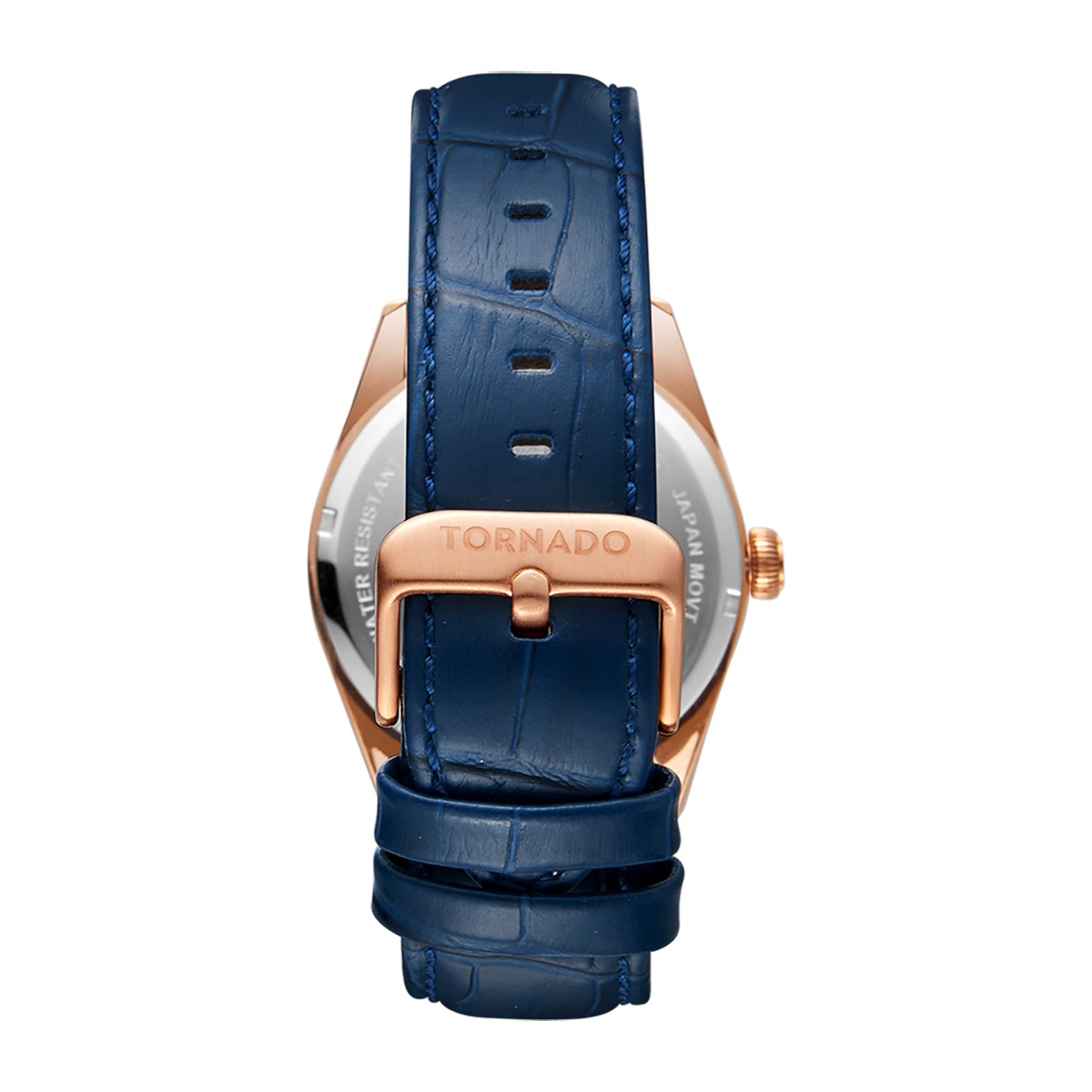 The CELESTIA CLASSIC in Rose Gold is an example of the ideal blend of traditional watchmaking with contemporary elements. The 42 mm round case is crafted from 316L stainless steel with brushed and polished surfaces that soften the warm rose gold tone. A blue genuine leather strap with a crocodile pattern complements the case and dial, along with a traditional tang buckle, reinforcing the classic character of the piece. The blue dial is clean and legible, designed for three-hand timekeeping with a discreet date display that integrates smoothly into the layout. The applied markers and needles match the rose gold case hue. Powered by the reliable Miyota 2115 quartz movement, the Celestia Classic offers accurate performance suited to daily wear. Sapphire-coated glass protects the dial, while a water resistance rating of 10 ATM adds practical versatility. With its measured proportions, calm color palette, and three-year warranty, this Celestia Classic delivers a timeless aesthetic grounded in everyday reliability.