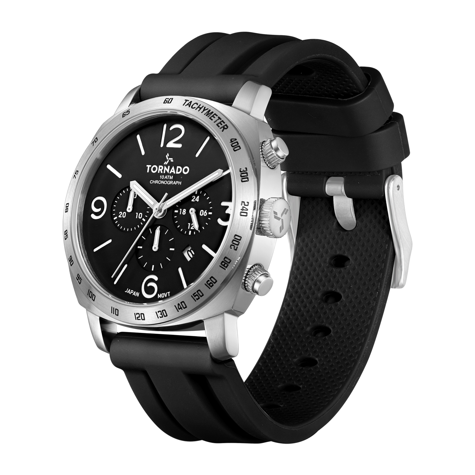 At its core is the Miyota JS25 chronograph movement, offering dependable timekeeping and precise chronograph functionality. With water resistance rated at 10 ATM, the watch is well suited for everyday use, including exposure to water during routine activities. The black high-quality silicone strap adds comfort and flexibility, secured with a traditional tang buckle for a secure fit.